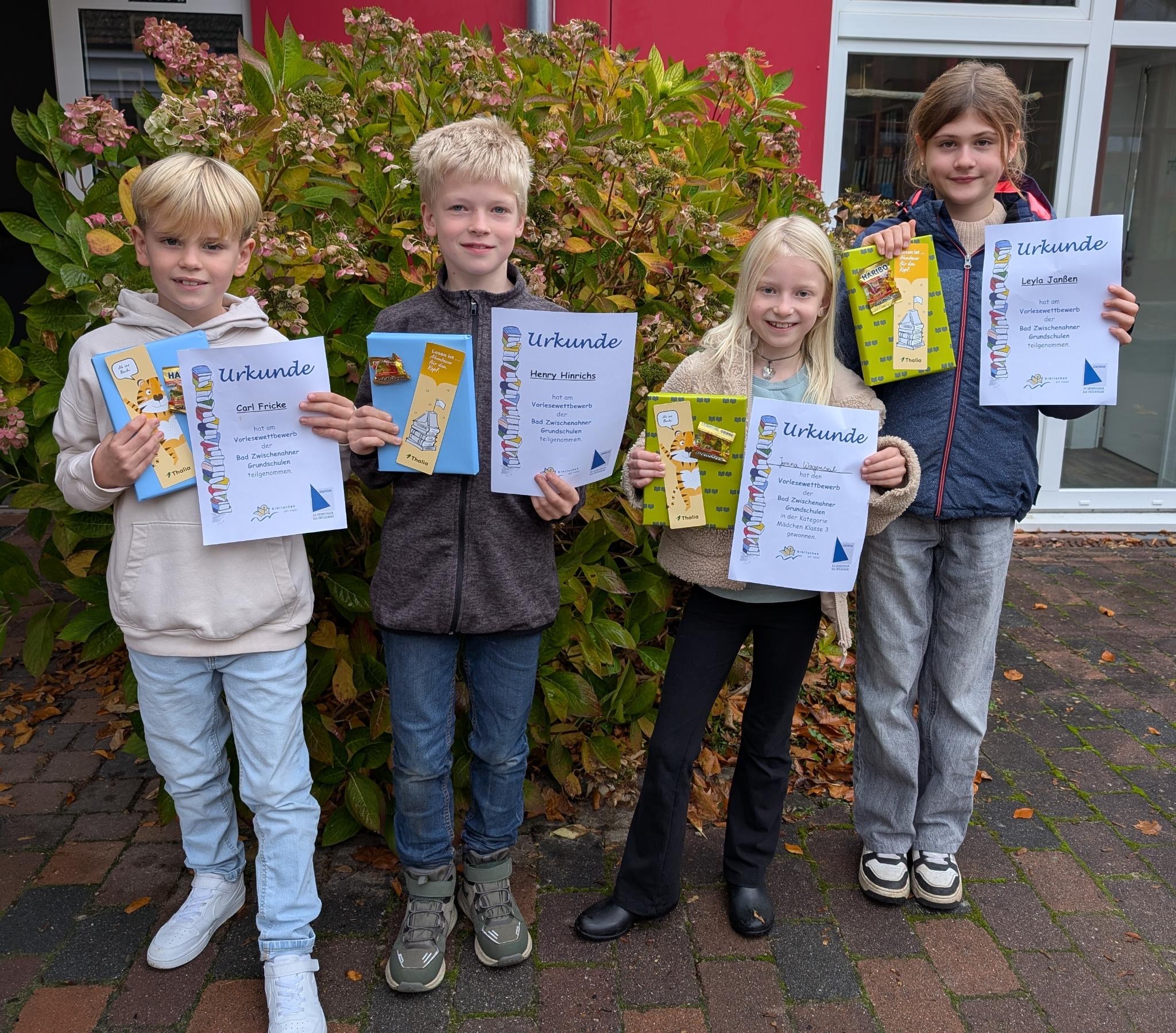 Unsere vier Schulsieger*innen sind heute zum regionalen Vorlesewettbewerb in die Bibliothek am Meer gefahren. Dort traten sie gegen die anderen Siegerinnen und Sieger aus den fünf Grundschulen des Kooperationsverbundes an. Bei den Mädchen der dritten Klassen hat Jonna für unsere Schule den Sieg geholt. Henry, Carl und Leyla belegten in ihrer Kategorie den zweiten Platz. Wir sagen herzlichen Glückwunsch unseren tollen Vorleser*innen. Wir sind stolz auf euch! Die tollen Buchpreise hat die Buchhandlung Thalia gestiftet. Danke schön!