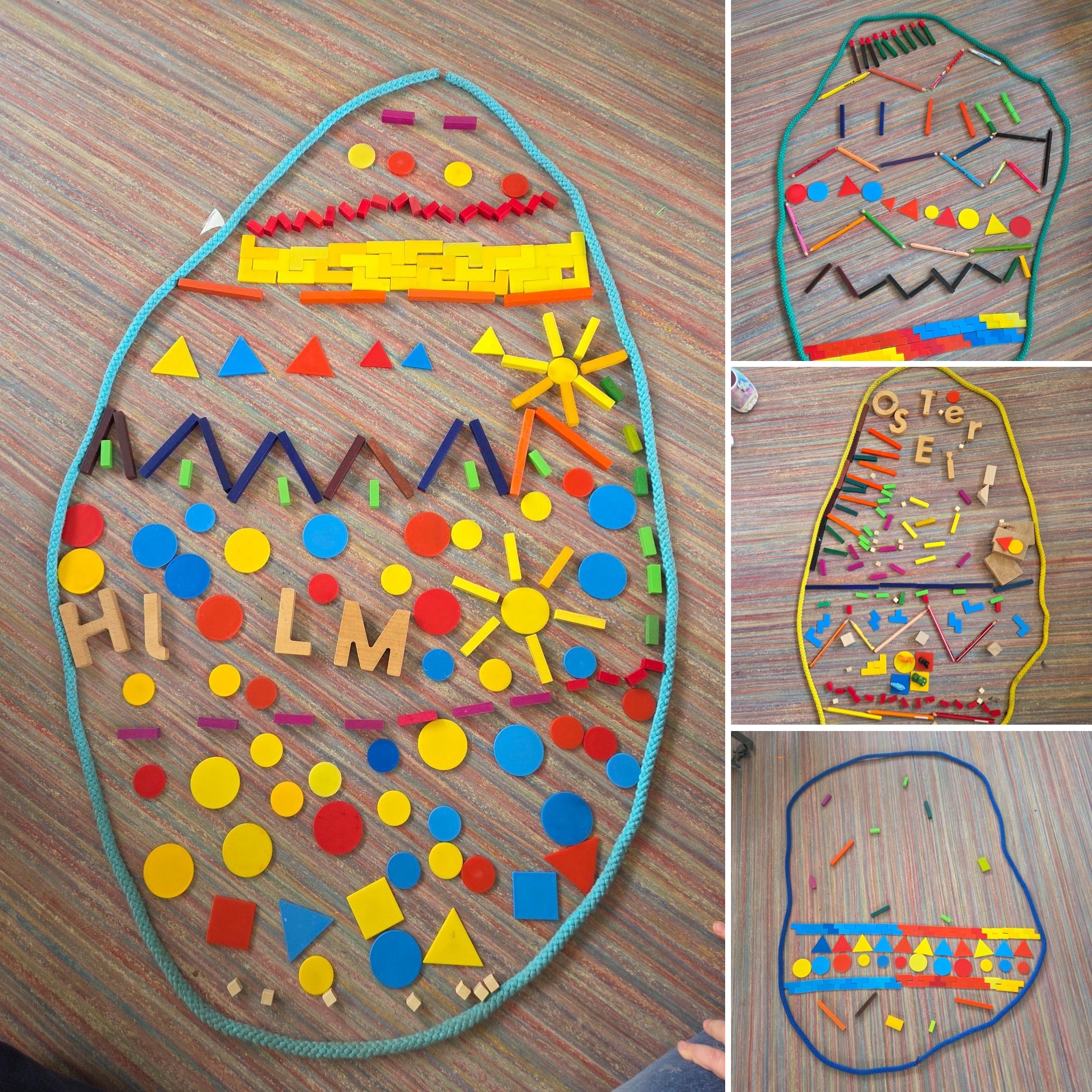 Die Kinder der 1a haben die geometrischen Formen Dreieck, Rechteck und Quadrat erforscht und damit Muster und Reihen gelegt.